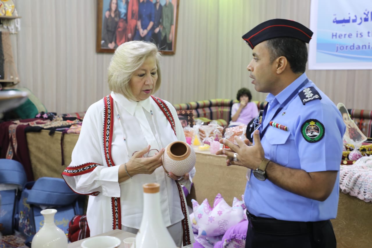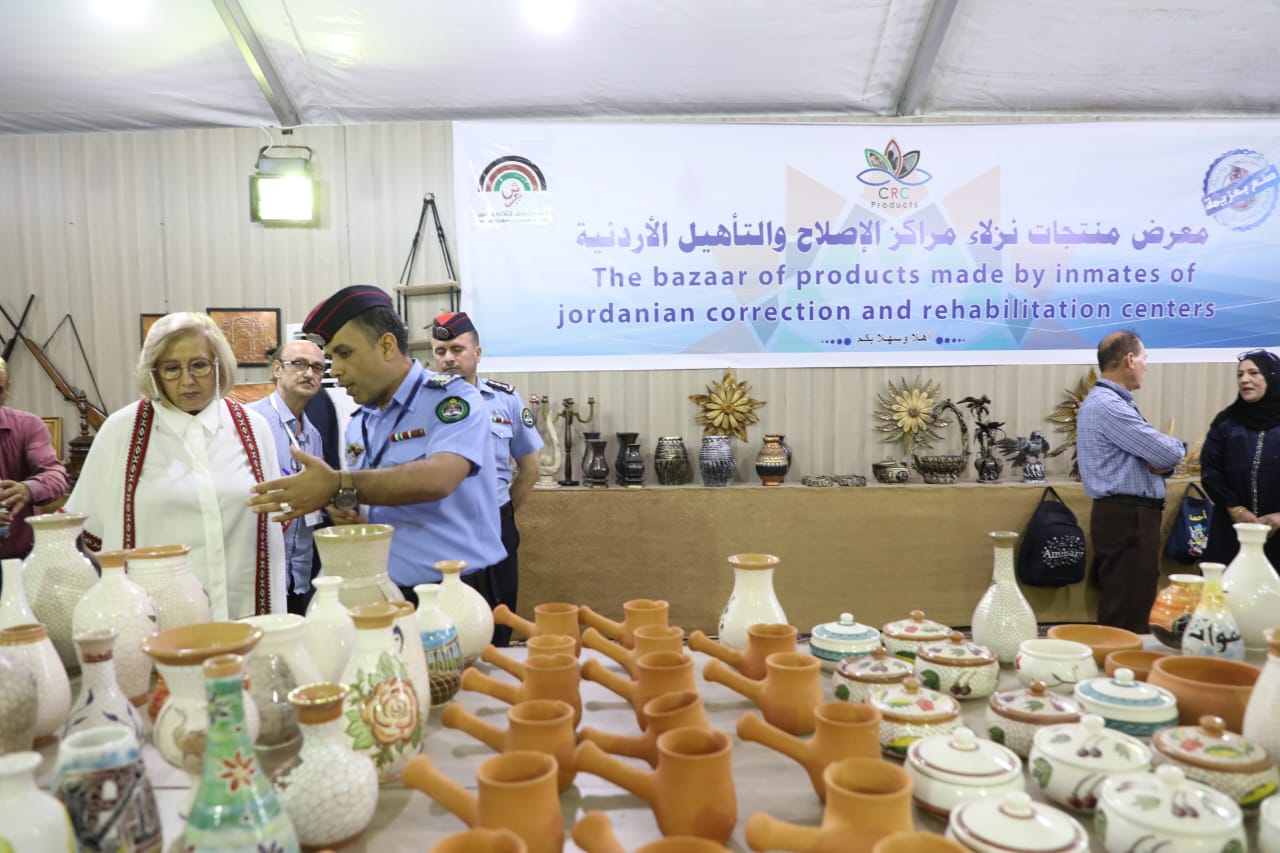 وتوجهت الى خيمة (منتجات نزلاء مراكز الإصلاح والتأهيل الأردنية) وتجولت بين منتجات النزلاء رافقها النقيب وسام موسى الخالدي الذي قدم لها شرحا وافيا عن مشغولات النزلاء من فخاريات وأثاث وتحف مختلفة.