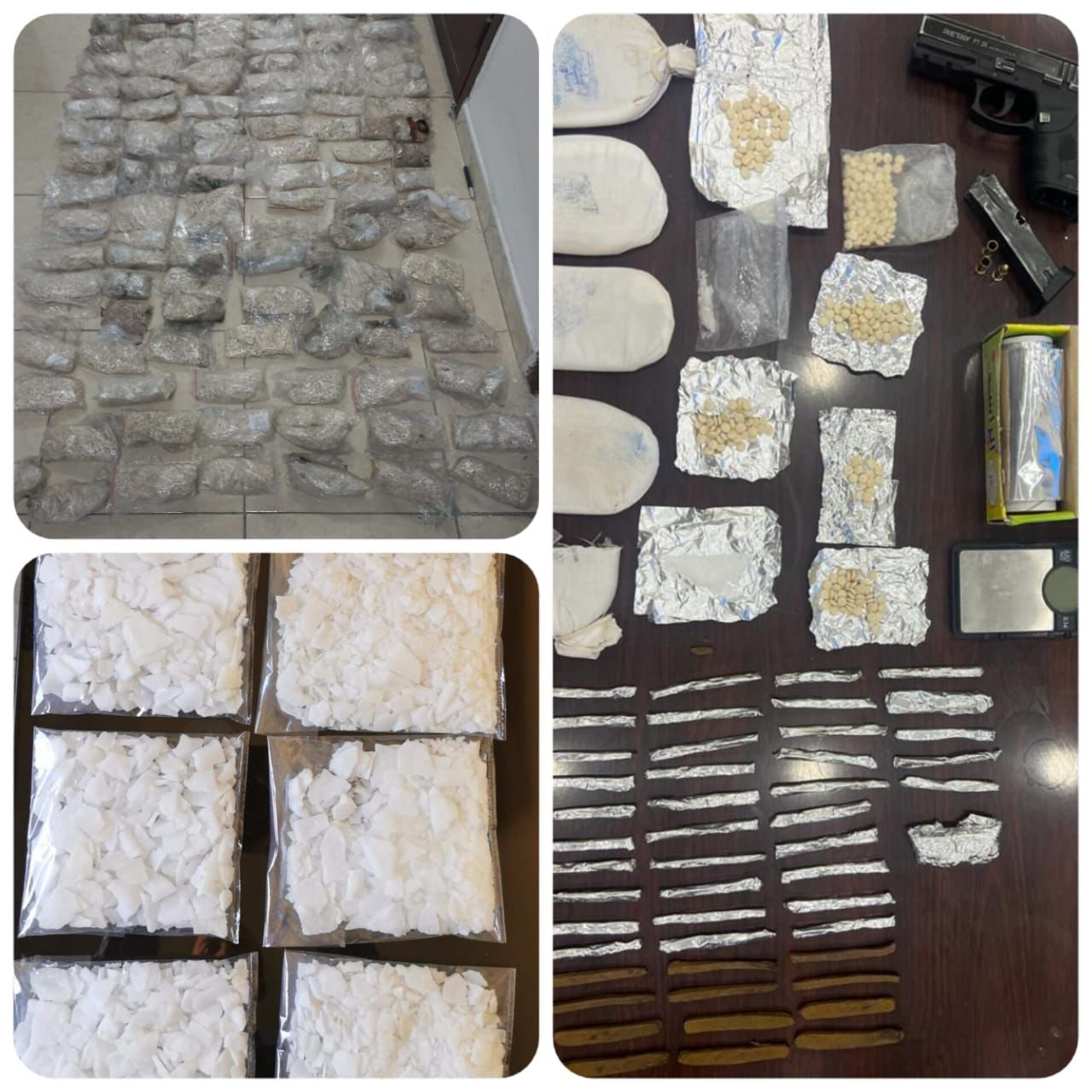 وفي البادية الوسطى نُفذت مداهمتان منفصلتان دوهم في الاولى شخصان مسلحان احدهما بحقه 5 طلبات امنية ، إذ أبديا مقاومة للقوة وقام احدهما باستخدام سلاح ناري واطلق النار باتجاه القوة فور مداهمته إلا أن القوة الأمنية تمكنت من السيطرة عليهما وضبطهما وبحوزتهما السلاح الناري المستخدم و 4 كفوف حشيش وكمية من مادة الكريستال المخدرة، فيما دوهم في الثانية مطلوب مصنف بالخطر وبحقه 9 طلبات امنية وأُلقي القبض عليه .