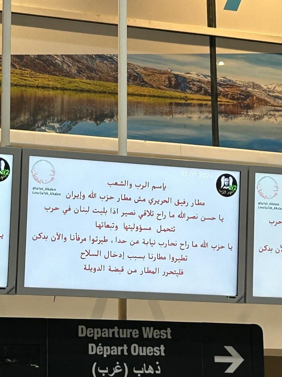أظهرت صورةٌ تناقلها مسافرون في مطار رفيق الحريريّ بالعاصمة اللبنانيّة بيروت، اختراق "هاكرز" للشاشات الموزّعة داخل المطار، واستبدال شاشات توقيت الطائرات بشاشة كُتب عليها: "مطار رفيق الحريري مش مطار حزب الله و ايران، يا حسن نصر الله ما راح تلاقي نصير إذا بليت لبنان في حرب تتحمل مسؤوليتها و تبعاتها، يا حزب الله ما راح نحارب نيابةً عن حدا، طيرتو مرفأنا و الآن بدكن تطيرو مطارنا بسبب إدخال السلاح فليتحرر المطار من قبضة الدويلة"