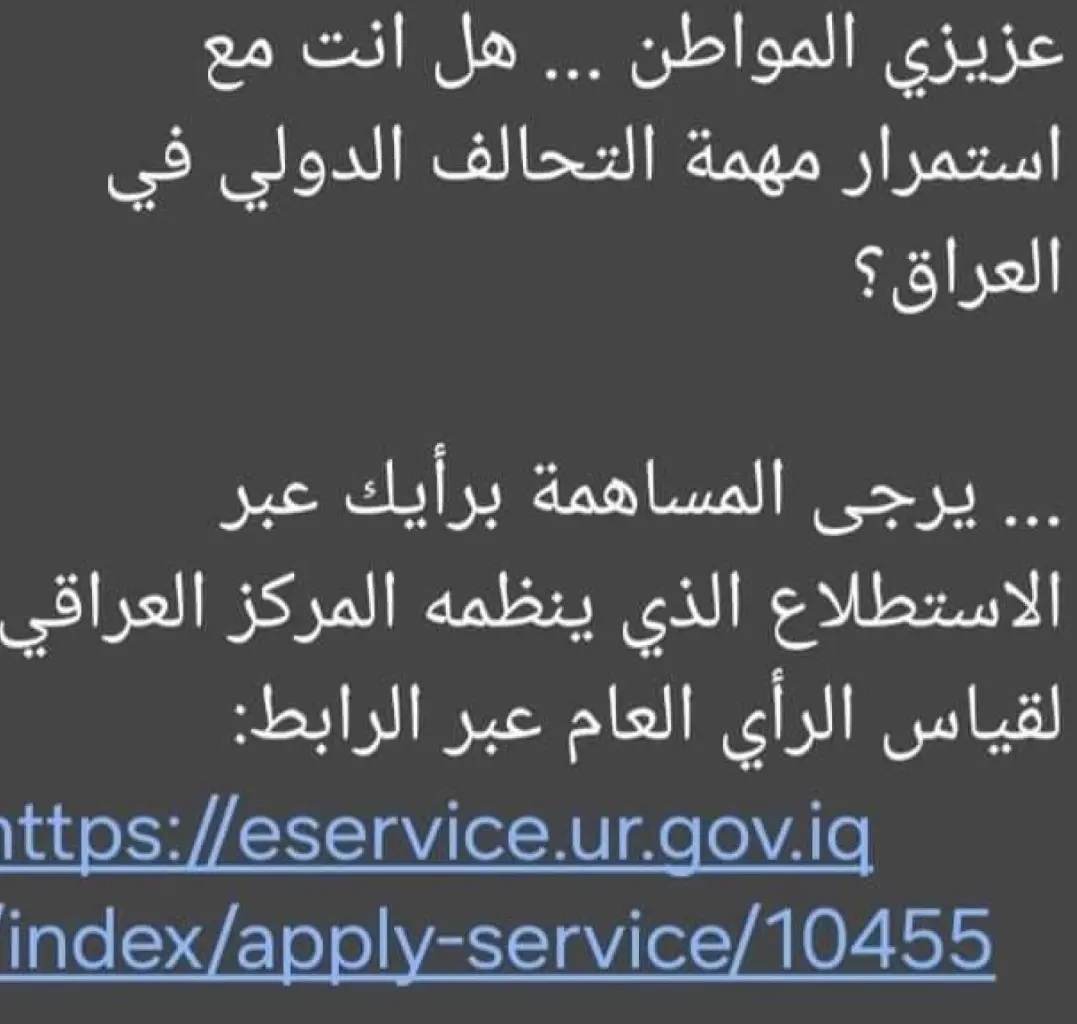 تلقى عدد كبير من العراقيين خلال اليومين الأخيرين، سؤالاً من خلال رسالة (SMS) عبر هواتفهم النقالة، نصه: "عزيزي المواطن... هل أنت مع استمرار مهمة التحالف الدولي في العراق؟". وأضيف رابط إلى نص الرسالة للإجابة عن السؤال.