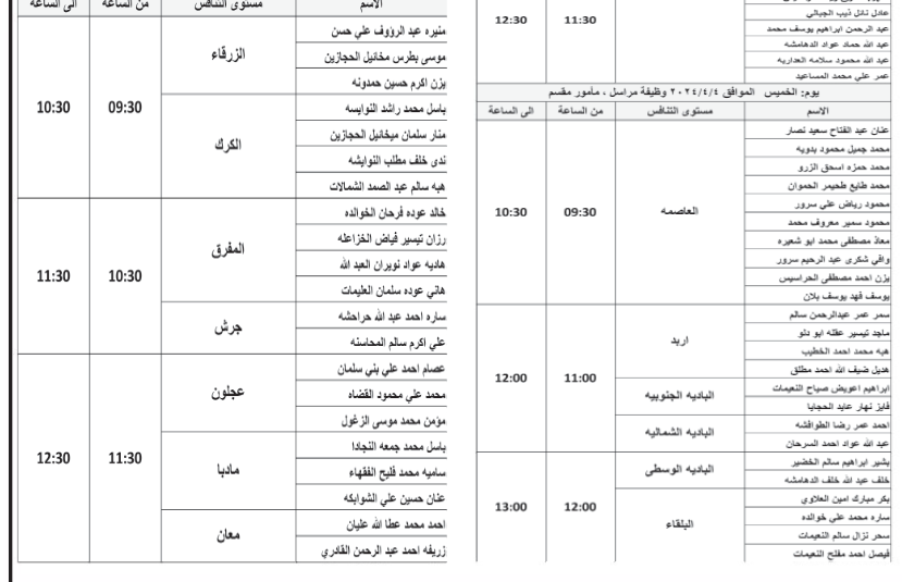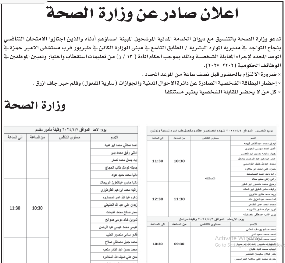دعت وزارة الصحة الاثنين، وبالتنسيق مع ديوان الخدمة المدنية المرشحين التالية أسماؤهم ممن اجتازوا الامتحان التنافسي الى مراجعة مديرية تنمية الموارد البشرية في مبنى الوزارة الكائن في طبربور قرب مستشفى الامير حمزة، لاجراء المقابلات الشخصية.