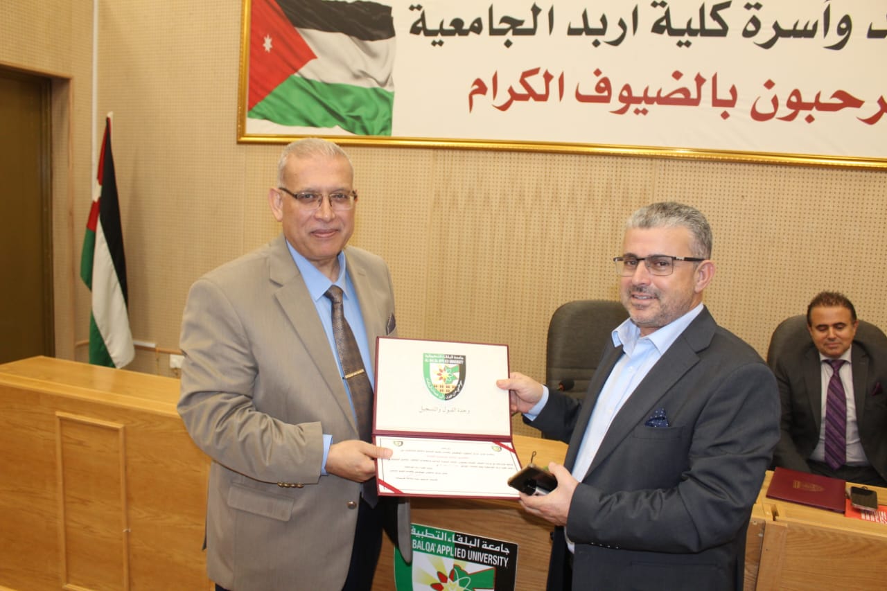 مندوباً عن رئيس جامعة البلقاء التطبيقية، رعى مدير مركز التطوير الوظيفي لكليات إقليم الشمال وعميد كلية إربد الجامعية، الأستاذ الدكتور يحيا سلامة خريسات، ورشة عمل بعنوان "كتابة السيرة الذاتية ومهارات مقابلات العمل"، التي نظمها المركز على مسرح الكلية، بمشاركة رجل الأعمال المهندس مازن خريسات وحضور الدكتور أسامة خريسات.