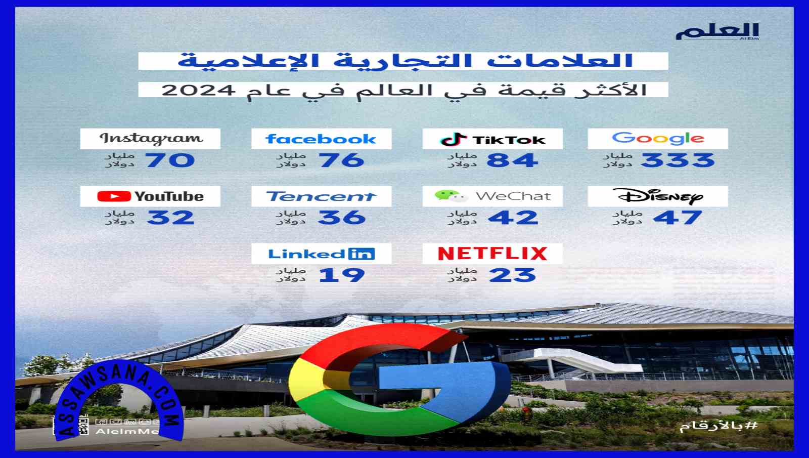 تصدرت جوجل القائمة كأكثر العلامات التجارية الإعلامية قيمة في العالم، حيث بلغت قيمتها 333.4 مليار دولار. تلتها منصة تيك توك، التي حققت قيمة 84.2 مليار دولار، مما يعكس التحول المتزايد نحو المنصات الرقمية ووسائل التواصل الاجتماعي.