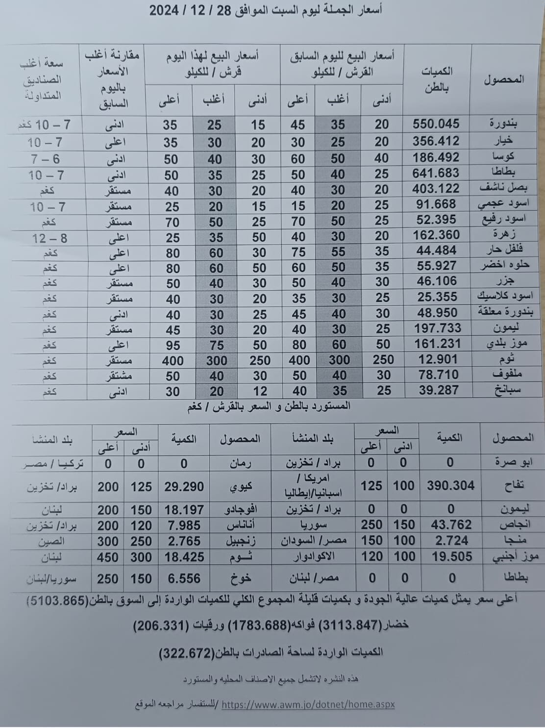 وفيما يلي نشرة مفصلة بأسعار الخضار والفواكه في السوق المركزي اليوم: