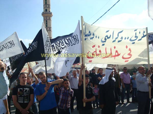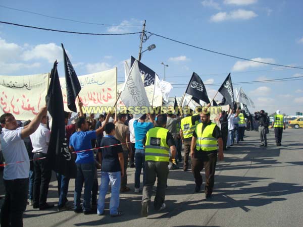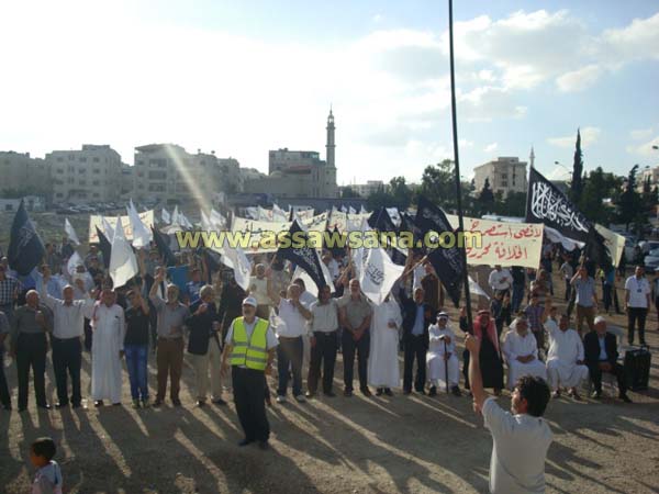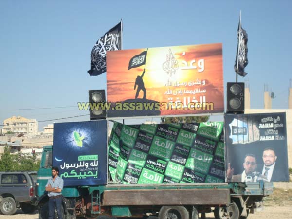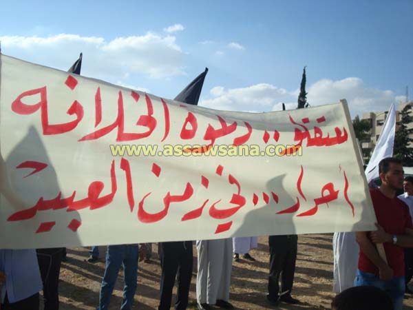 وتم رفع الرايات السوداء والألوية البيضاء المكتوب عليها (لا إله إلا الله محمد رسول الله)، ويافطات تطالب بإقامة الخلافة وتستصرخ جيوش المسلمين واخرى منددة بإعتقال أعضاء الحزب.