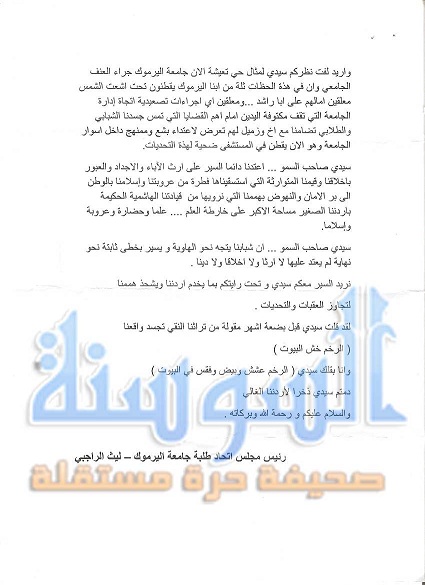 وقال الاتحاد في بيان صدر عنه الاثنين وحصلت السوسنة على نسخه منه : "ان هذا الإجراء الذي اتخذته ادارة الجامعة و المتمثل بقمع الحرية الطلابية في جامعة اليرموك هو مخالف للتوجيهات الملكية السامية في إرساء قواعد الحوار و إطلاق الحريات في جامعاتنا الأردنية".