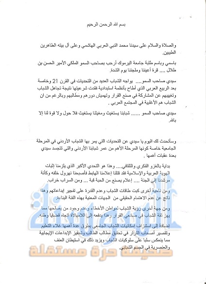 اربد – السوسنة - حمل اتحاد طلبة جامعة اليرموك الجامعة ممثلة برئيسها الدكتور عبدالله الموسى مسؤولية منع رئيس الاتحاد من القاء كلمة اثناء زيارة الامير الحسن بن طلال للجامعة الاثنين.