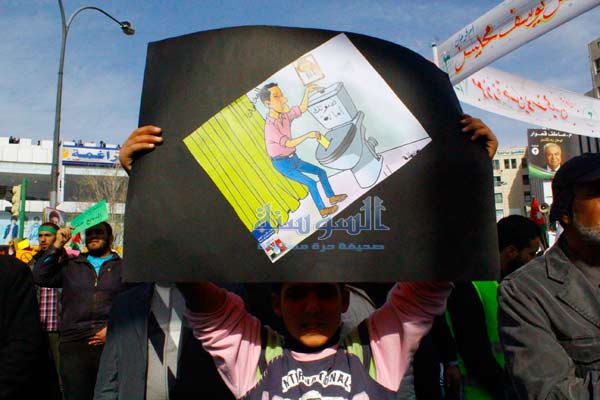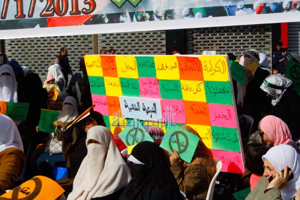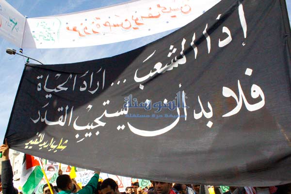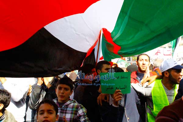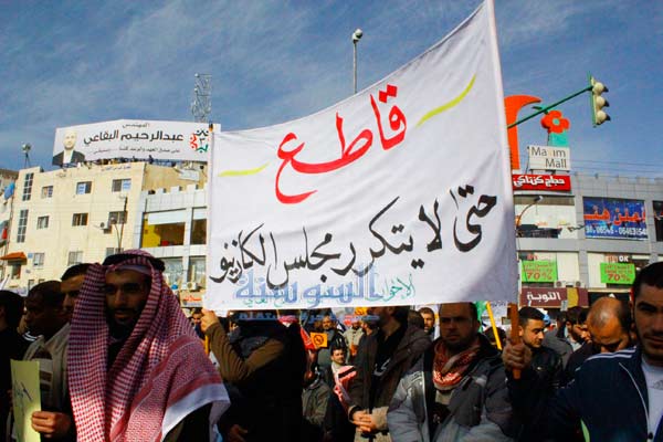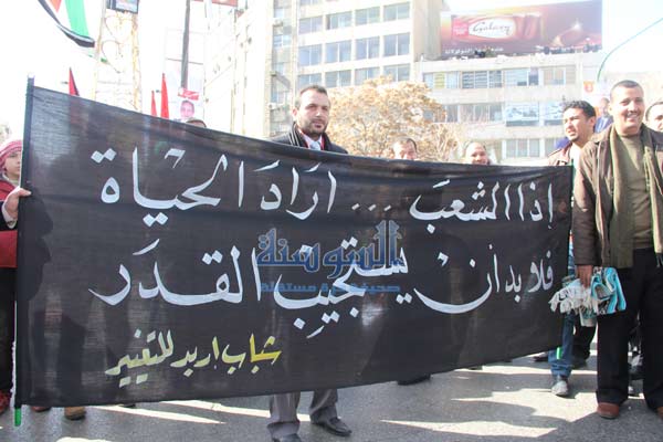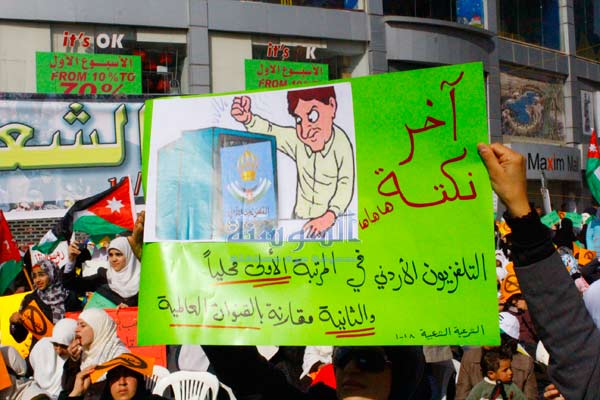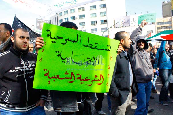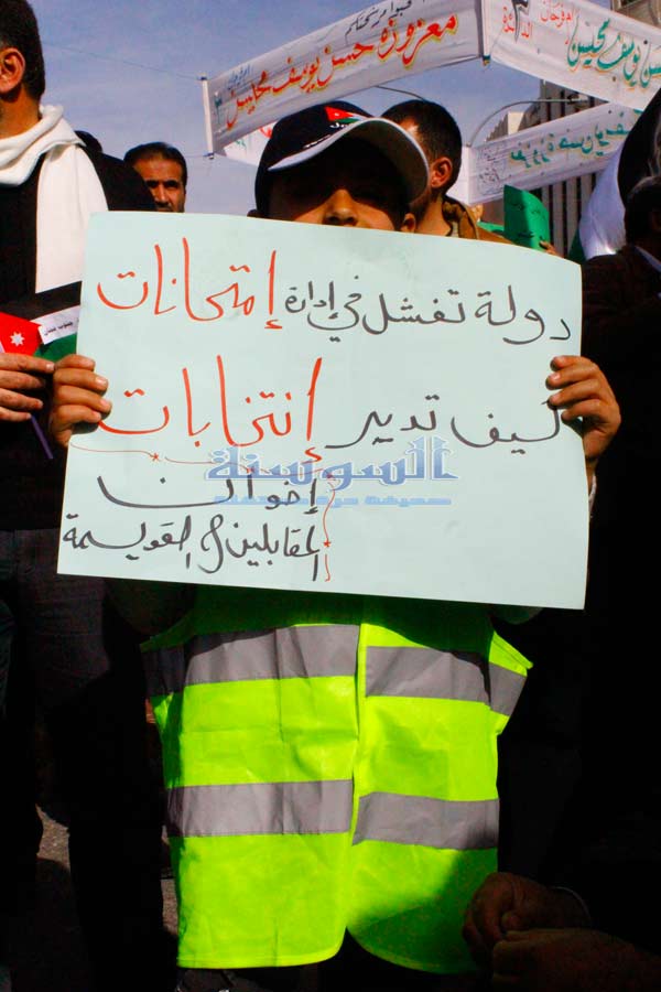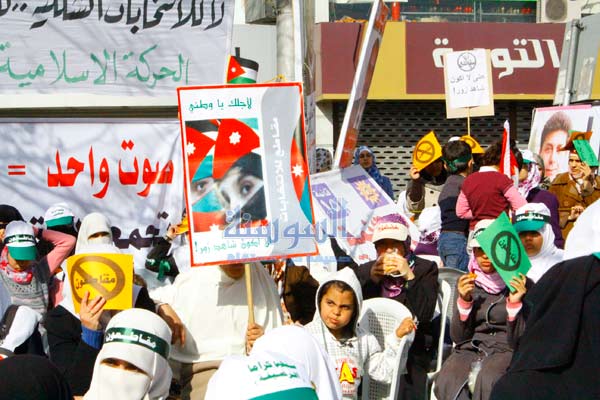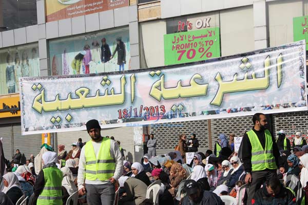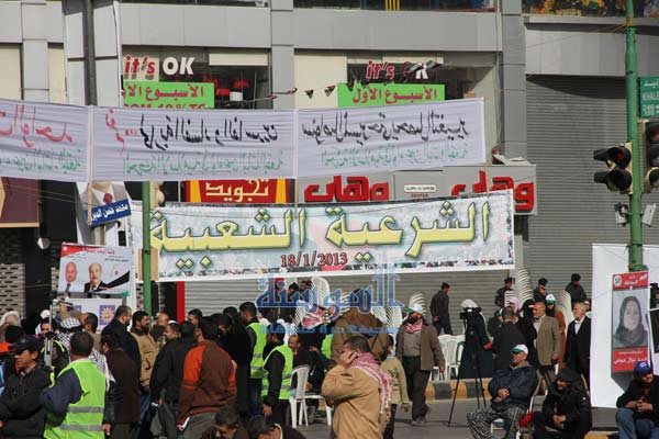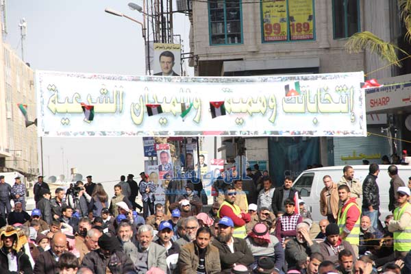 كما رفع المشاركون يافطات تؤكد على مقاطعتهم للانتخابات النيابية التي ستجري يوم الأربعاء المقبل، "لا لقانون الصوت الواحد"، "انتخاباتك وهمية وللميدان الشرعية"، فيما رفع الشعار الرئيسي للفعالية، "الشرعية الشعبية – 18-1-2013".