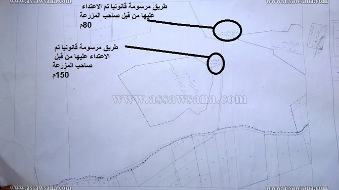 اهالي المنطقة بينوا ان آليات صاحب المزرعة قامت بجرف طريقين يوصلان منازل المواطنين بالمنطقة الحرجية المجاورة (طريق من الجهة الشرقة بطول 80م - واخرى غربية بطول 150م)، اضافة الى زراعة اكثر من 20 شجرة في كلتا الطريقين ناهيك عن السياج المذكور، مما منعهم من الوصول الى المناطق الحرجية المجاورة.