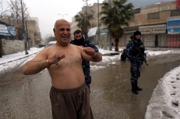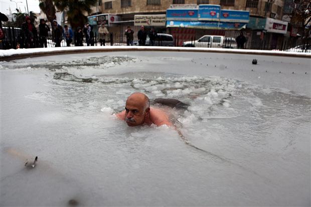 وقال إسحاق أبو مياله (60 عاما)، لوسائل الإعلام بينما كان يسبح في بركة تكسوها الثلوج "ما شاهدته على شاشات التلفاز من معاناة لأبناء شعبنا في قطاع غزة والمشردين في سوريا جراء العاصفة الثلجية، دفعني لأقف هذه الوقفة التضامنية مع شعبنا في غزة والشام الإخوة وفي المخيمات".