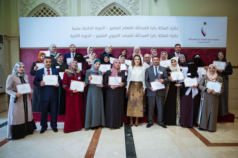 وكرمت جلالة الملكة رانيا العبدالله المعلمين والمرشدين التربويين المتميزين الذين بلغ عددهم 23 معلماً و5 مرشدين تربويين.