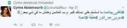 السوسنة - نشرت الفنانة سيرين عبد النور تغريدة على حسابها الخاص بموقع التواصل الاجتماعي تويتر ردّت من خلالها على الإتهامات التي تعرضت لها والتي تقول إنّها قلّدت مظهر الفنانة هيفاء وهبي في مسلسل "الحرباية"، بخاصة بعد الحرب الكبيرة على مواقع التواصل الإجتماعي بين جمهور النجمتين.
