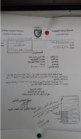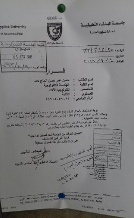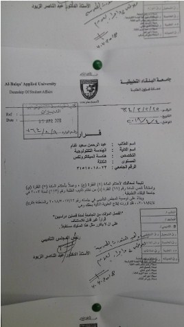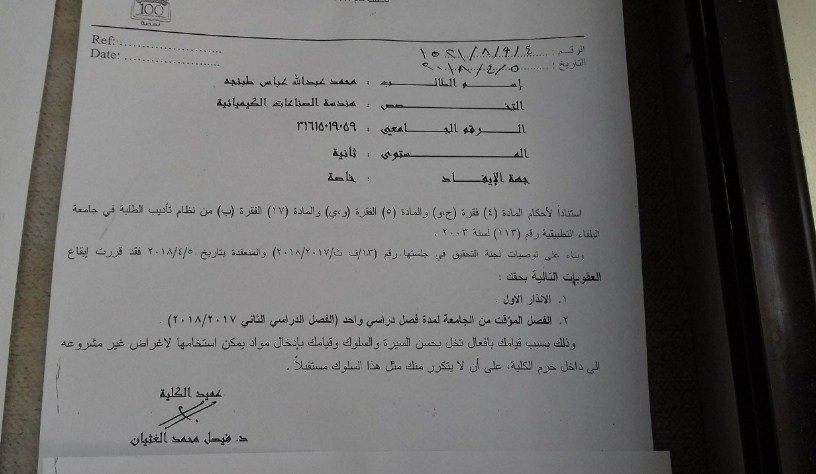 السوسنة - قررت كلية الهندسة التكنولوجية " البوليتكنك " التابعة لجامعة البلقاء التطبيقية فصل عدد من طلابها ومن ضمنهم اعضاء مجلس طلبة بسبب قيامهم بأفعال تخل بحسن السيرة والسلوك ، وفق ما جاء في كتاب الفصل .