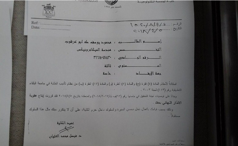 فيما يقول الطلبة إن الفصل جاء على خلفية مطالبتم بالملف الحقوقي ومطالبتم بالافراج عن رئيس مجلس الطلبة ايمن العجاوي الذي كان محتجز عند الاجهزة الامنية بسبب المطالبة بنفس الملف الحقوقي ووجهت عقوبة الانذار النهائي والانذار المزدوج لباقي الطلاب