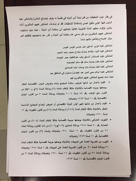 وفي اطار إجراء التحقيقات من قبل نيابة أمن الدولة في قضية ما يعرف بقضية (مصانع الدخان) والمشتكى عليه الرئيس فيها عوني مطيع عيسى واستكمالاً للتحقيقات فقد تم استدعاء المشتكى عليهم المذكورين ادناه والذين توافرت بحقهم الادلة القانونية الكافية لاحالتهم إلى محكمة أمن الدولة وتقرر بعد استجوابهم توقيفهم لدى مراكز الاصلاح والتأهيل بالتهم ادناه: