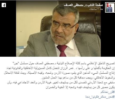 السوسنة - حمّلت كتلة الإصلاح النيابية، حكومة الدكتور عمر الرزاز كامل المسؤولية الأخلاقية والقانونية تجاه إنتاج مسلسل "جن" الذي تضمن الفاظا نابية ومشاهد مخلة اثارت ضجة في المجتمع الاردني .
