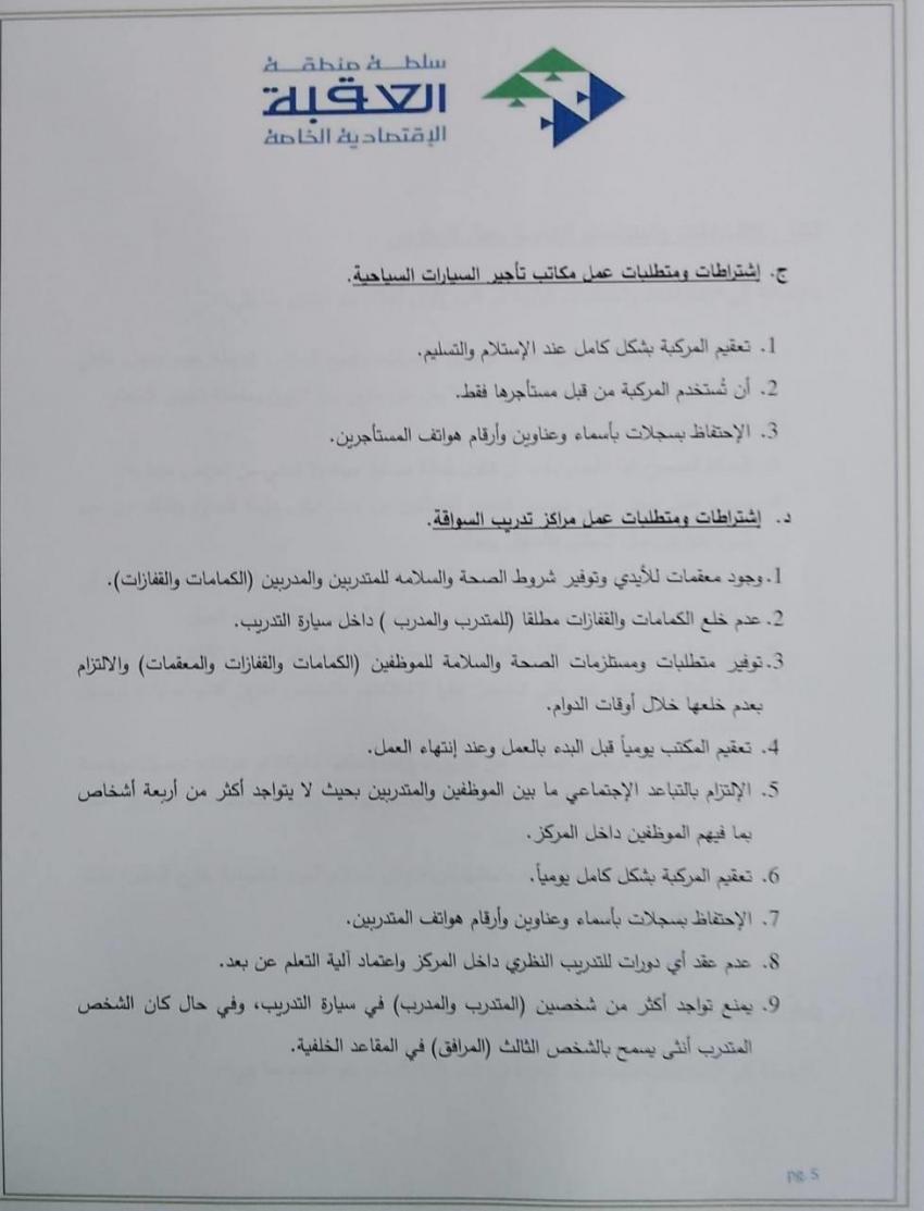 وقالت السلطة إن الاشتراطات تحتوي على تدابير السلامة والوقاية الصحية للحد من انتشار فيروس كورونا