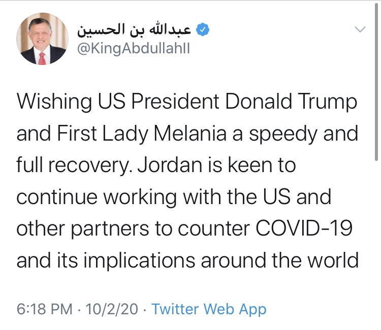 وقال الملك عبر تغريدة على حسابه الرسمي بمنصة "تويتر" : "أتمنى للرئيس ترامب والسيدة الأولى ميلانيا الشفاء العاجل، الأردن سيظل يعمل مع الولايات المتحدة والشركاء الآخرين على محاولة السيطرة على كوفيد-19 وآثاره حول العالم".