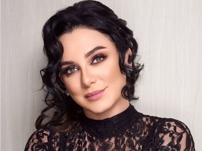 وظهرت الفنانة السورية منتشية بشعر بني فاتح ومكياج خفيف وفستان مكشوف من أعلى الصدر.