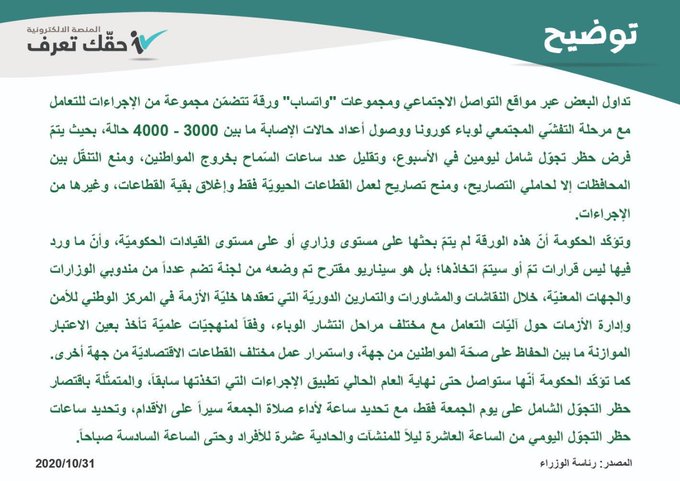 كما أكدت الحكومة بأن هذه القرارت سيناريو تم مناقشته فقط، وأنها ملتزمة بالقوت الحاضر بالإجراءات المعمول فيها من حظر يوم الجمعة وحظر جزئي باقي أيام الأسبوع يبدأ من الساعة العاشرة مساءً.