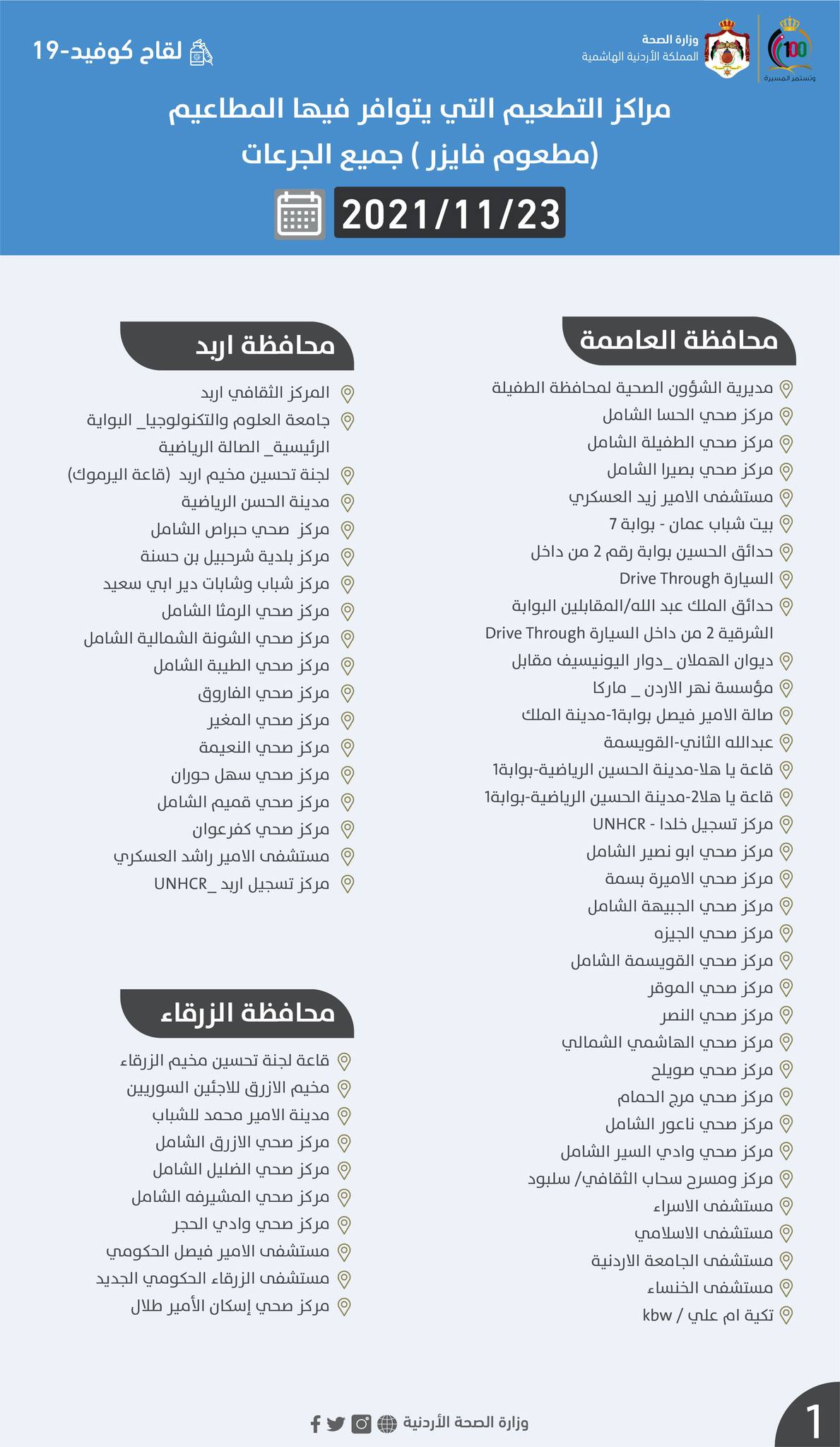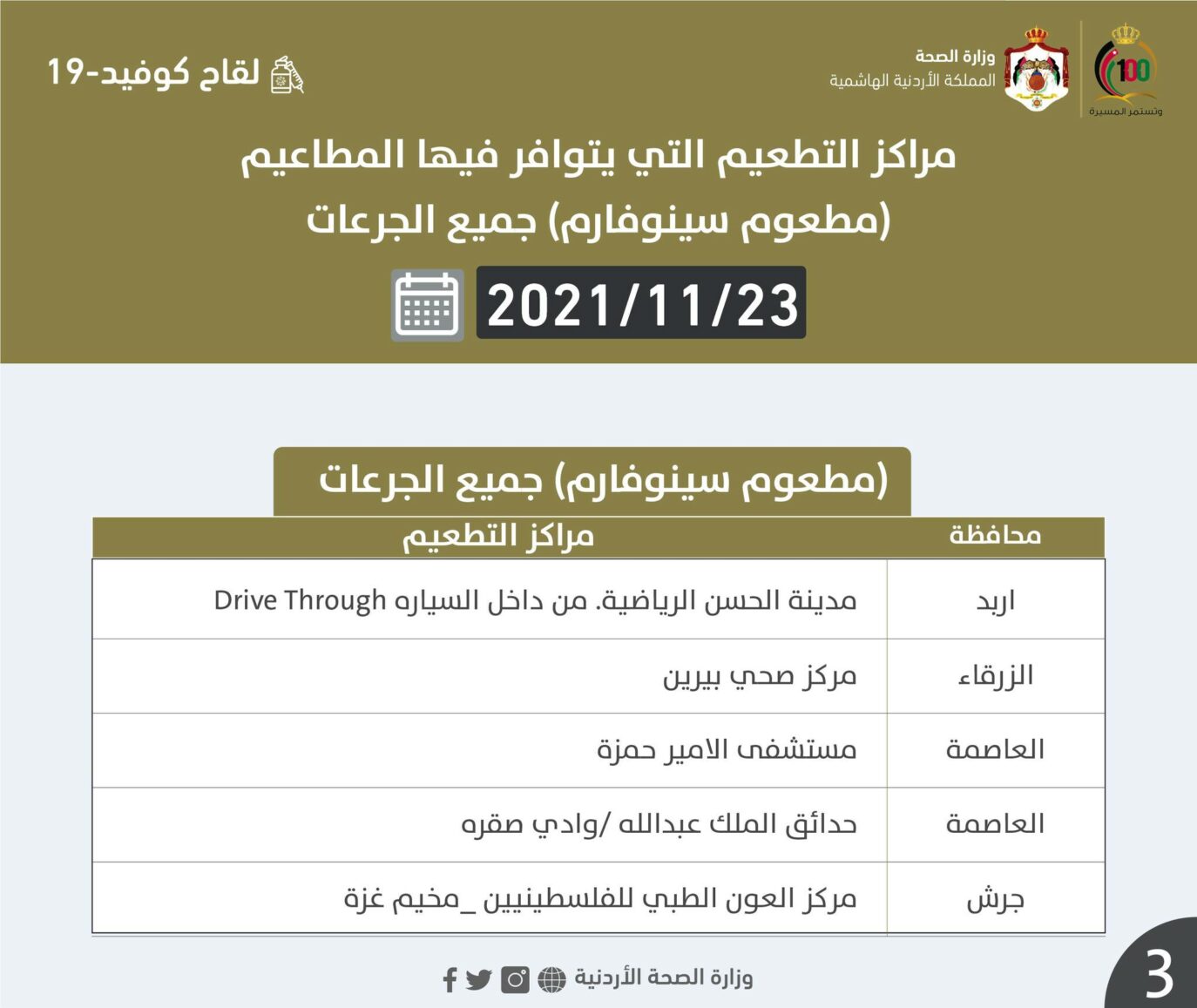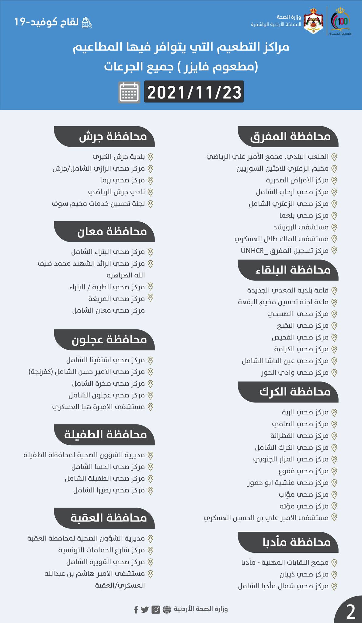 السوسنة - أعلنت وزارة الصحة عن مراكز التطعيم ليوم الثلاثاء التي يتوافر فيها المطاعيم لجميع الجرعات.