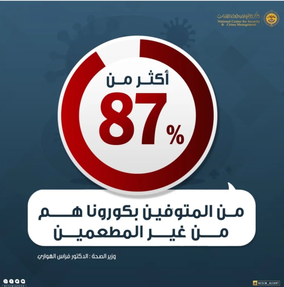السوسنة - قال وزير الصحة فراس الهواري، إن أكثر 87 % من وفيات كورونا بالأردن هم من غير المطعمين بلقاح كورونا.