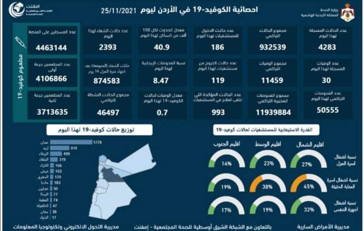 30 وفاة و4283 إصابة جديدة بكورونا في الاردن