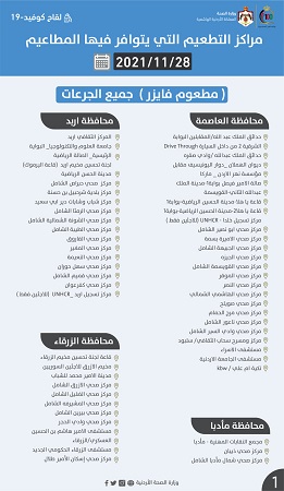 السوسنة : أفصحت وزارة الصحة عن مراكز التطعيم ليوم الاحد 2021/11/28 التي يتوافر فيها المطاعيم جميع الجرعات .
