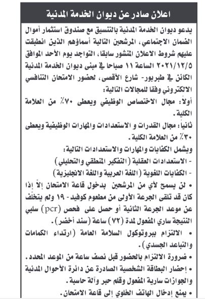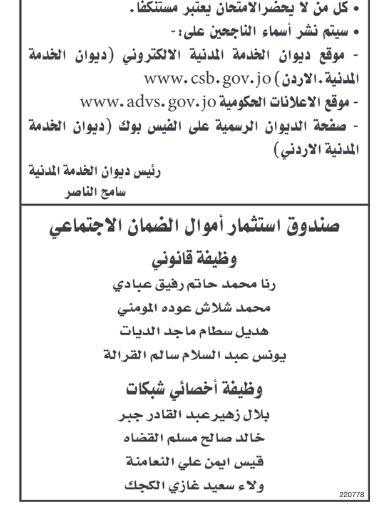 السوسنة : نشر ديوان الخدمة المدنية بالتنسيق مع صندوق استثمار أموال الضمان الاجتماعي أسماء مرشحين لحضور الامتحان التنافسي الالكتروني بتخصيي الشبكات و القانون .