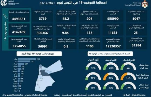 25 وفاة و 5047 اصابة جديدة بكورونا في الأردن