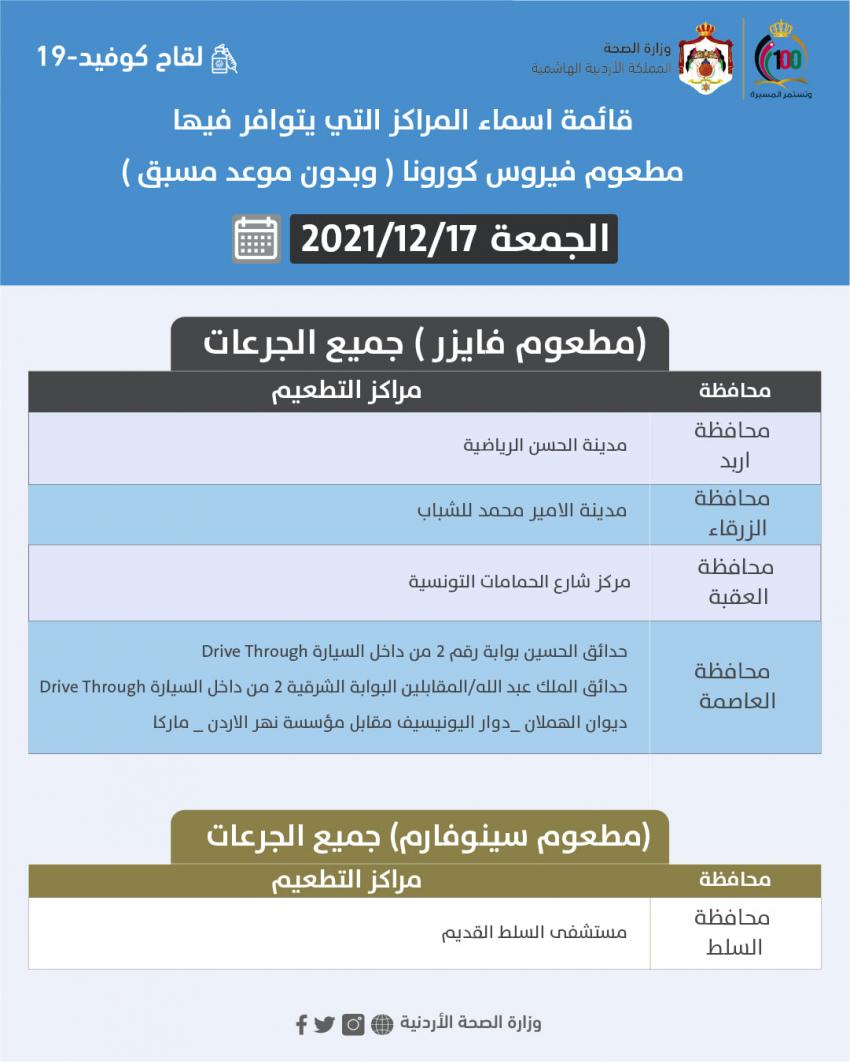 السوسنة - أعلنت وزارة الصحة قائمة باسماء المراكز التي يتوافر فيها مطعوم فيروس كورونا (وبدون موعد مسبق) من جميع الجرعات ليوم الجمعة