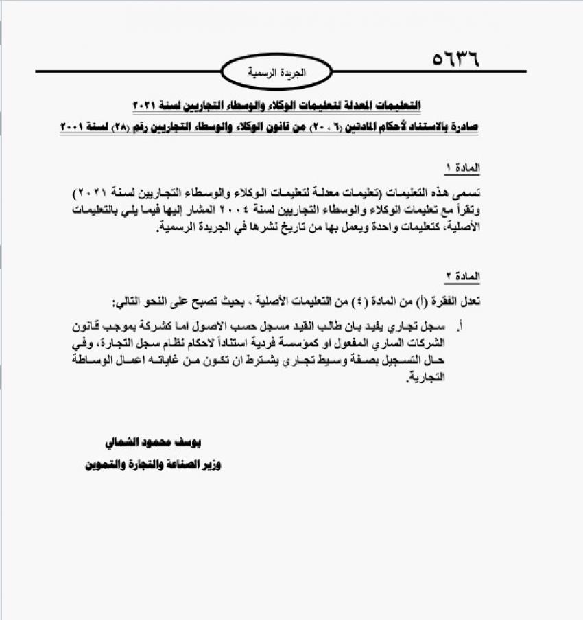 السوسنة - أصدر وزير الصناعة والتجارة والتموين يوسف الشمالي تعليمات معدلة لتعليمات الوكلاء والوسطاء التجاريين لسنة 2021.