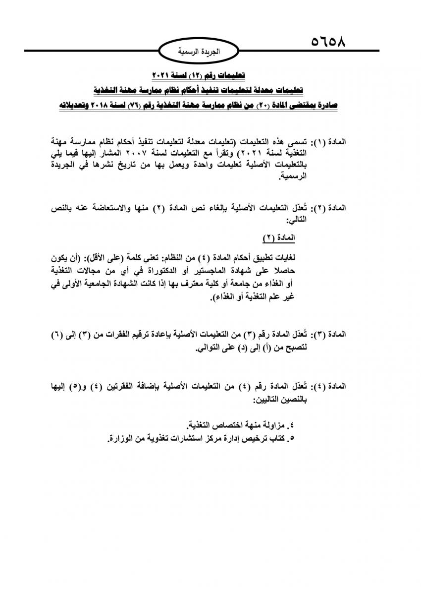 السوسنة - صدر في عدد الجريدة الرسمية تعليمات معدلة لتعليمات تنفيذ أحكام نظام ممارسة مهنة التغذية.