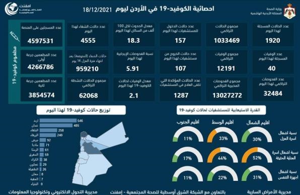 الأردن .. 40 وفاة و1920 اصابة كورونا جديدة