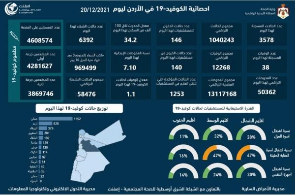 الأردن .. 38 وفاة و3578 إصابة جديدة بكورونا