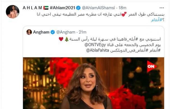 السوسنة - بمنشور كتبته عبر صفحتها الخاصة على موقع التواصل الإجتماعي، توجهت الفنانة الإماراتية أحلام برسالة للفنانة المصرية انغام، قالت فيها: "بنستناكي طول العمر انتي عارفة أن مطربة مصر العظيمة تبقى أختي أنا"، حيث كانت أنغام قد كتبت عبر صفحتها: "استنوني مع ابلة فاعهيتها ليلة رأس السنة".