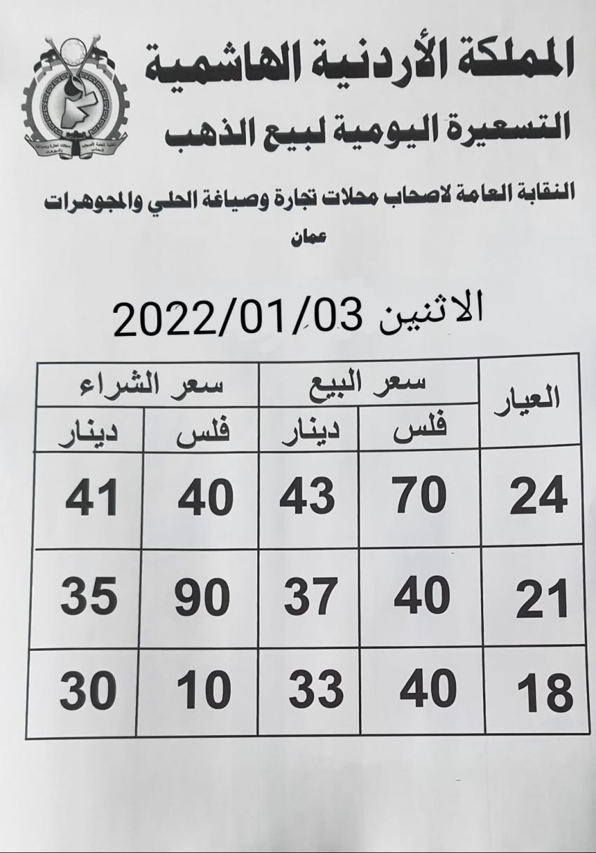 السوسنة - بلغ سعر بيع غرام الذهب عيار 21 الأكثر رغبة من المواطنين بالسوق المحلية اليوم الاحد، 37.40 دينارا لغايات شراء المواطنين من محلات الصاغة، مقابل 35.90 دينارا لجهة البيع.، وفقا للتسعيرة الصادرة عن النقابة العامة لأصحاب محال تجارة وصياغة الحلي والمجوهرات، اليوم الأحد 2 كانون الثاني 2022.