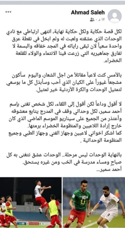 السوسنة : ودع أحمد سمير لاعب نادي الوحدات و المنتخب الوطني اليوم الثلاثاء جماهير المارد الأخضر معلناً عن انتهاء مسيرته الكروية مع نادي الوحدات .