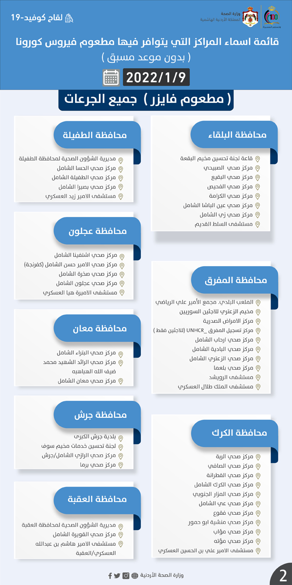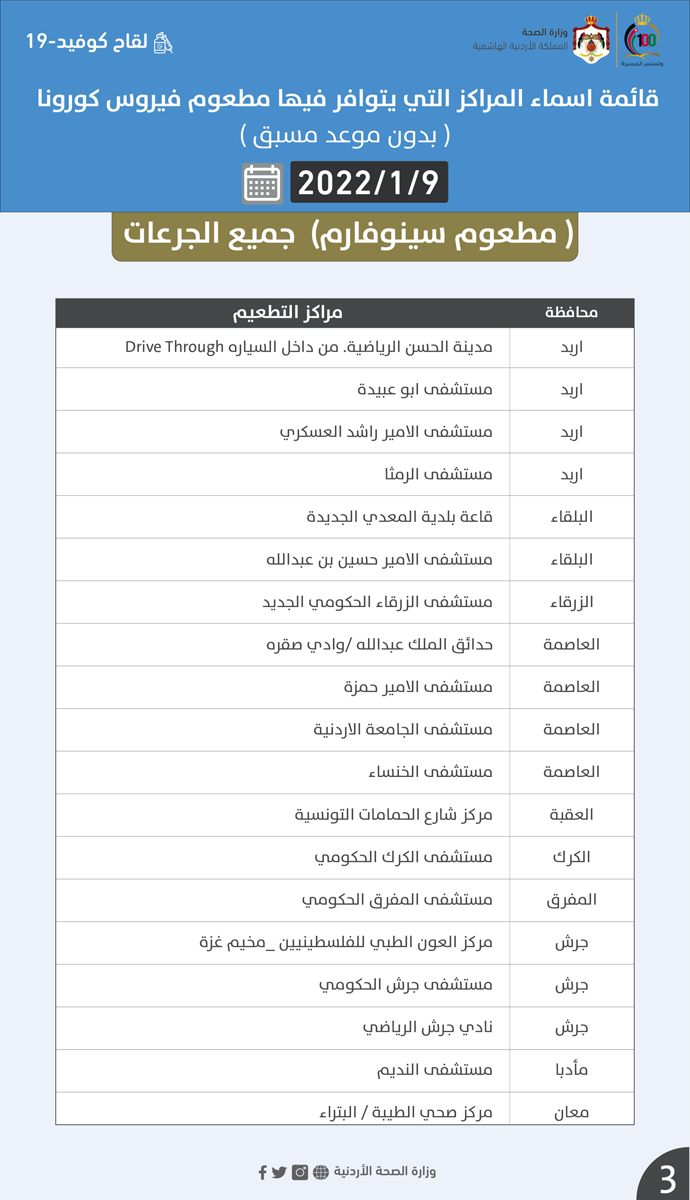 السوسنة : نشرت وزارة الصحة اليوم السبت قائمة اسماء المراكز التي يتوافر فيها مطعوم فيروس كورونا وبدون موعد مسبق لجميع الجرعات ليوم الاحد الموافق 2022/1/9.
