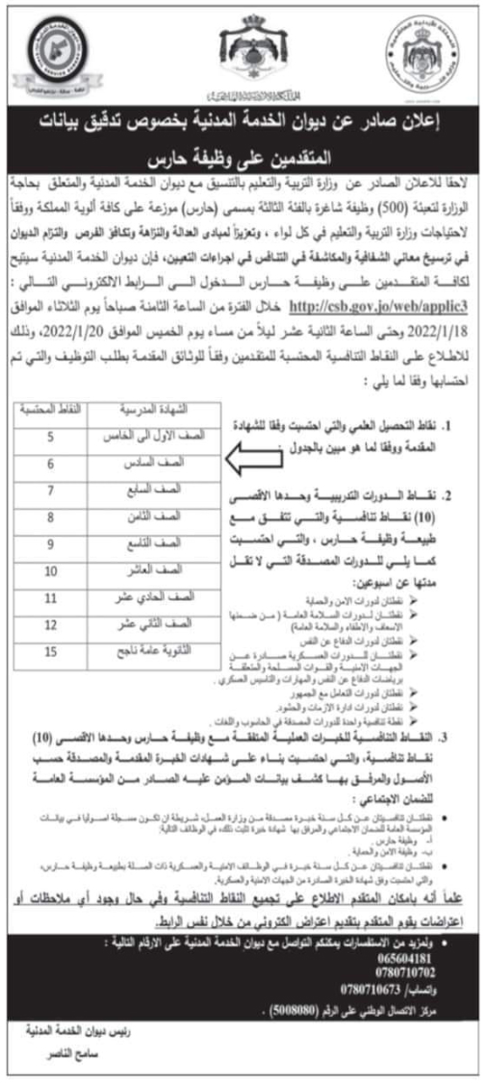 السوسنة - اعلن ديوان الخدمة عن سماحه للمتقدمين لوظيفة حارس في وزارة التربية ، الدخول الى موقع ديوان الخدمة لمدة 48 ساعة للاطلاع على مجموع النقاط التنافسية المحتسبة لهم.