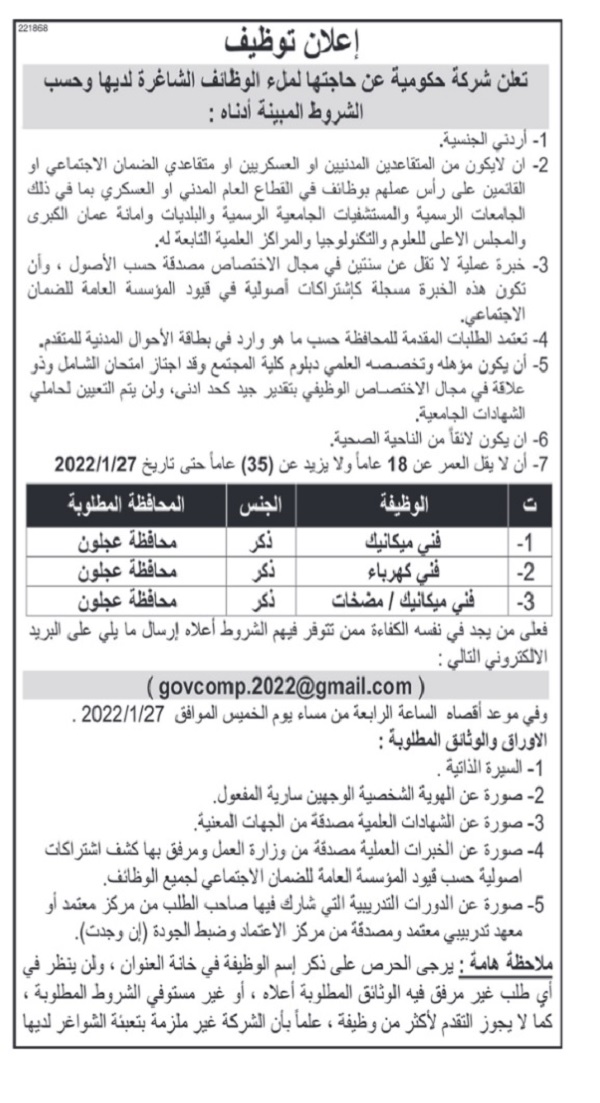 السوسنة  - أعلنت شركة حكومية، اليوم الإثنين،  عن حاجتها لتعبئة شواغر عدد من الوظائف.