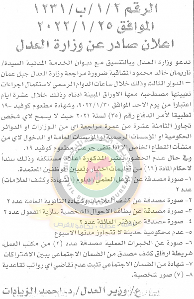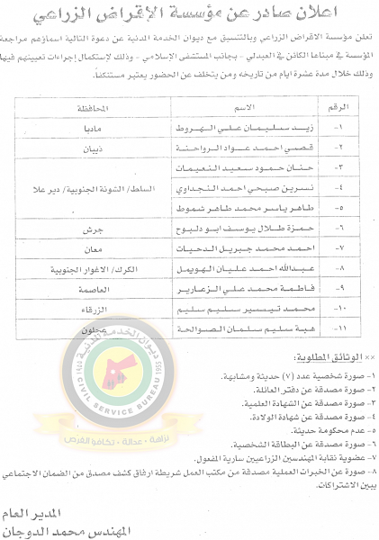 السوسنة - دعا ديوان الخدمة المدنية بالتعاون مع مختلف الوزارات والمؤسسات الحكومية، التالية اسماؤهم لاجراء المقابلات الشخصية وعقد الامتحان التنافسي لغايات التعيين.