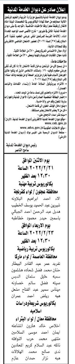 عمان - السوسنة - قسم اخبار الأردن : دعا ديوان الخدمة المدنية بالتنسيق مع وزارة التربية والتعليم، مرشحين لحضور الامتحان التنافسي الإلكتروني.