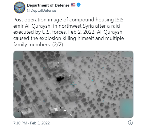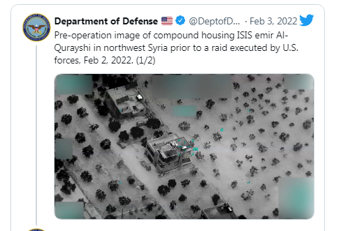 السوسنة - نشرت وزارة الدفاع الأمريكية صورتين للمنزل الذي تم استهدافه أثناء العملية الأمريكية للقضاء على قائد تنظيم "داعش" أبو إبراهيم الهاشمي القرشي في سوريا.