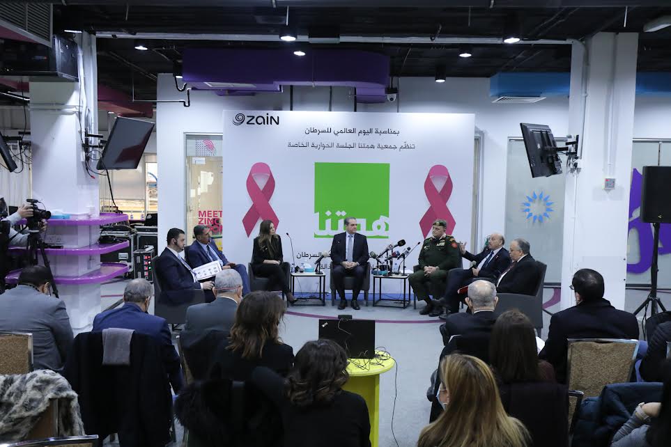 عمّان – السوسنة - بمناسبة اليوم العالمي للسرطان وتحت رعاية وزير الصحة الدكتور فراس الهواري، نظمت جمعية همتنا جلسة حوارية خاصة بعنوان " الجهود الوطنية في مواجهة السرطان: اتحاد – أمان – عدالة" و بمشاركة كل العميد الدكتور يوسف الزريقات مدير عام الخدمات الطبية الملكية والدكتور منذر الحورات مساعد مدير مركز الملك الحسين للسرطان، والاستاذ الدكتور جمال ملحم مدير مستشفى الجامعة الأردنية، والاستاذ الدكتور محمد الغزو مدير مستشفى الملك عبد الله المؤسس، وبدعم من شركة زين.