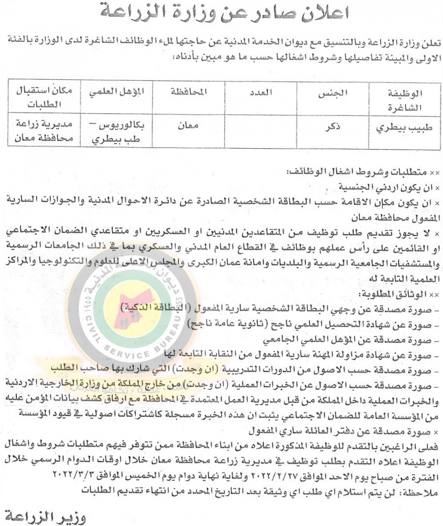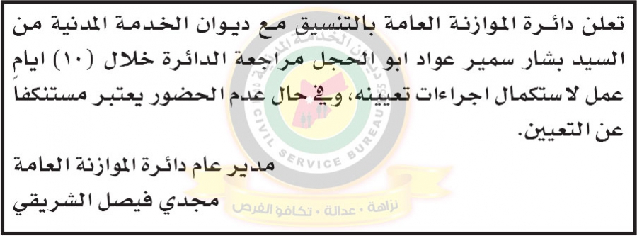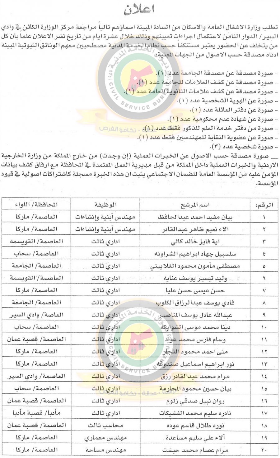 السوسنة - اخبار الاردن- دعا ديوان الخدمة المدنية بالتعاون مع مختلف الوزارات والمؤسسات الحكومية، التالية اسماؤهم لاجراء المقابلات الشخصية وعقد الامتحان التنافسي لغايات التعيين.