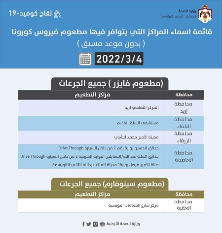 السوسنة - اخبار الاردن - أعلنت وزارة الصحة قائمة بأسماء المراكز التي يتوافر فيها مطعوم فيروس كورونا (بدون موعد مسبق) جميع الجرعات ليوم الجمعة الموافق 2022/3/4.