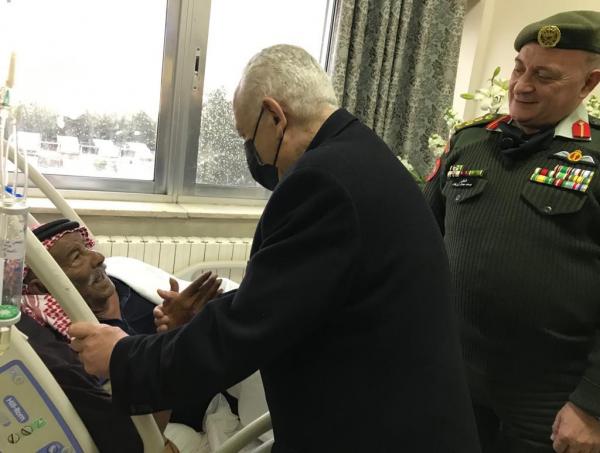 السوسنة - اخبار الاردن - مندوبا عن جلالة الملك عبدالله الثاني، اطمأن رئيس الديوان الملكي الهاشمي يوسف حسن العيسوي على الوضع الصحي لأحد المحاربين القدامى في صفوف الجيش العربي، مصطفى جدعان الخرشة، وهو من أواخر المرابطين في الدفاع عن القدس الشريف، الذي يرقد على سرير الشفاء في مدينة الحسين الطبية.