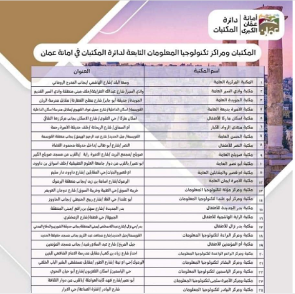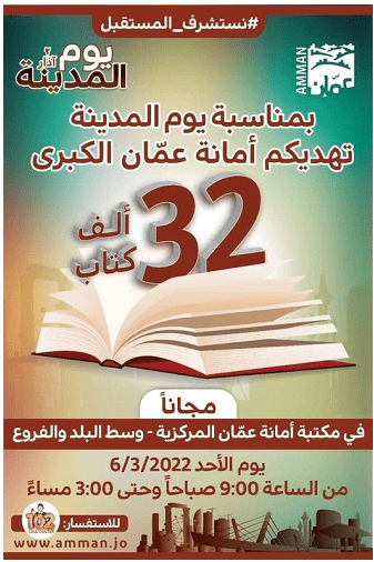 السوسنة - اعلنت امانة عمان ، الاحد ، عن توزيع 32 ألف كتاب مجانا ضمن فعاليات يوم مدينة عمان