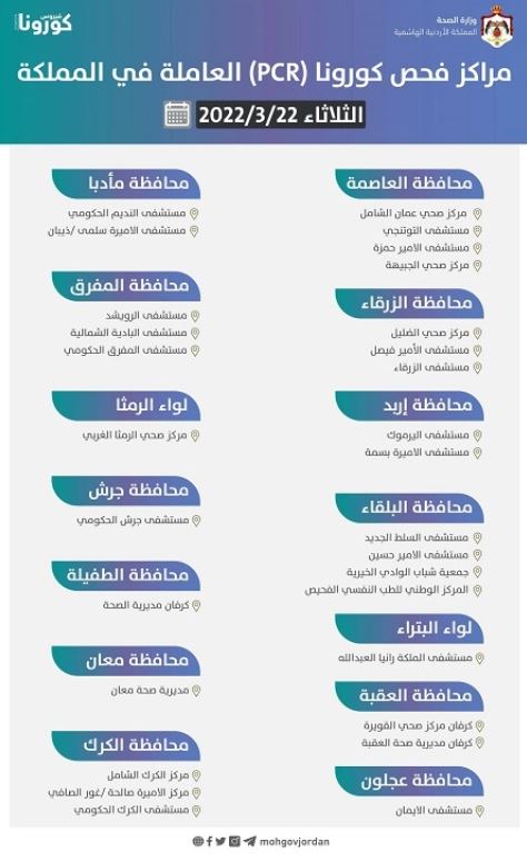 بالأسماء .. ماركز فحص كورونا العاملة يوم الثلاثاء
